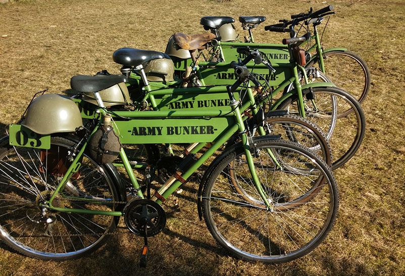 Ekskursija ar militārajiem velosipēdiem 10 eiro no cilvēka(ekskursija 5,- + velo noma 5,-) Ir 10 militārie velosipēdi.